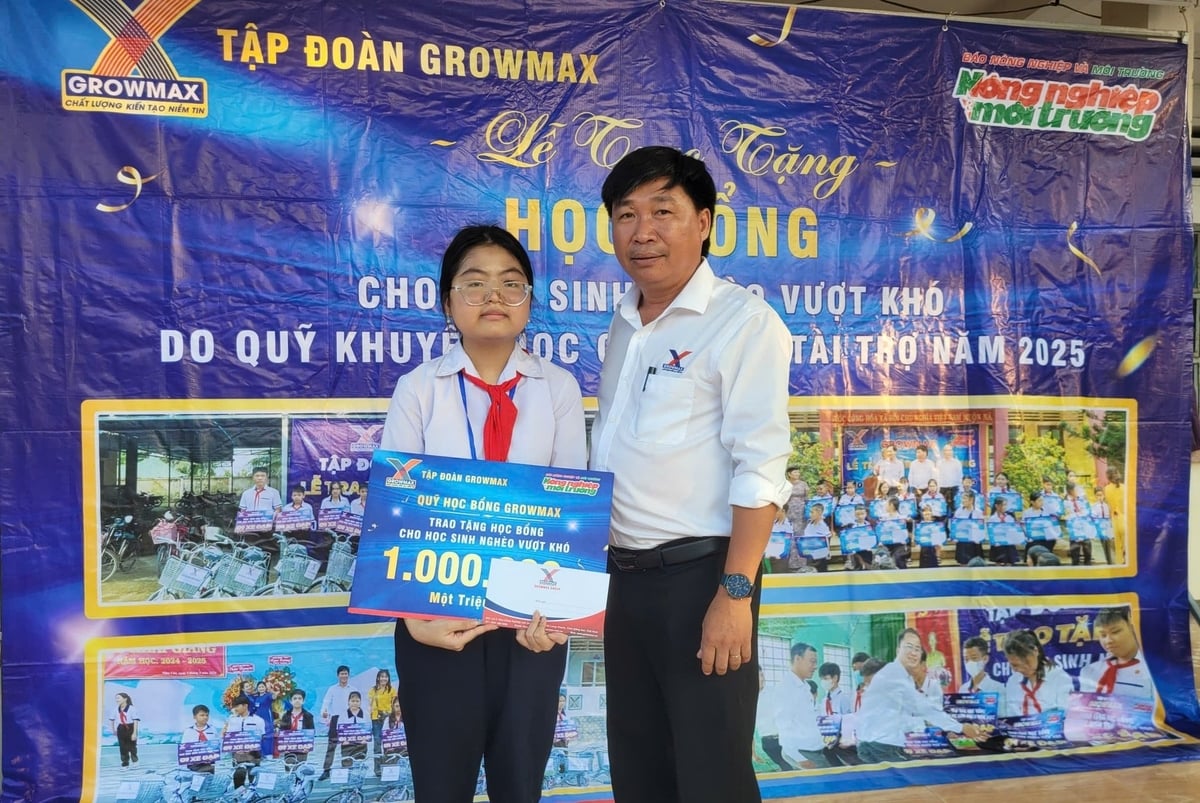 Cuối giờ chiều 22/9, đại diện Tập đoàn GrowMax tại miền Trung cùng Báo Nông nghiệp và Môi trường có mặt tại Trường THCS Tam Quan Nam (phường Hoài Nhơn, Gia Lai) để trao 10 suất học bổng cho 10 học sinh nghèo vượt khó, học giỏi của nhà trường, mỗi suất trị giá 1 triệu đồng.